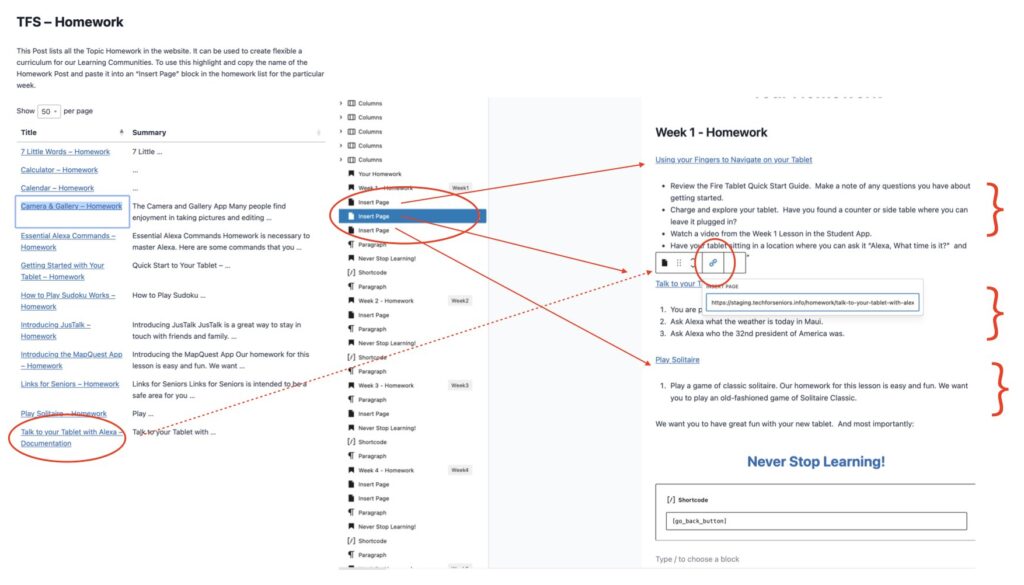 Finally, you may need to modify the Homework associated with that week’s lesson. Again we start with a listing of all the homework posts available (see TFS Homework Post) – so far we have built homework with all the default topics. If a homework is not built for a topic you would like to use you will need to build one using a current homework post as a template., Now copy the homework post name (the URL will also be copied automatically). Next in the learning community links page create a “insert page” Block in the appropriate week and paste the title/URL into the link area of the insert page. You will need an “insert page” Block for each lesson.