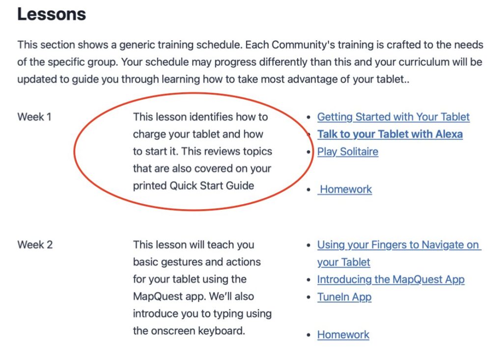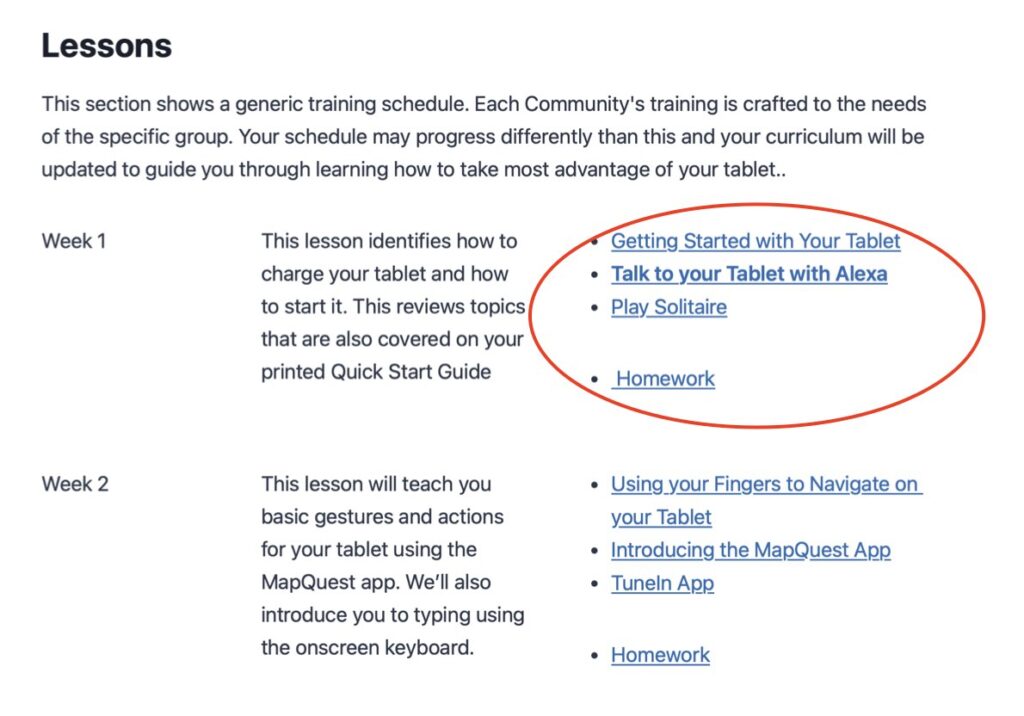 This screen shot shows the generic lesson plan in the template. The URLs of the lessons included in Week 1 of the course are circled in red.