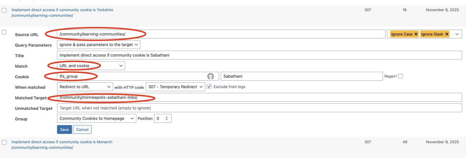 When entering through the Links for Seniors App, the current cookie value is simply passed though.  If the student has previously logged in through the Student App their cookie will still be available for us to use to customize their experience.   The next picture shows the values used to implement a redirection. Setting this up is all part of adding a new Learning Community to the website.