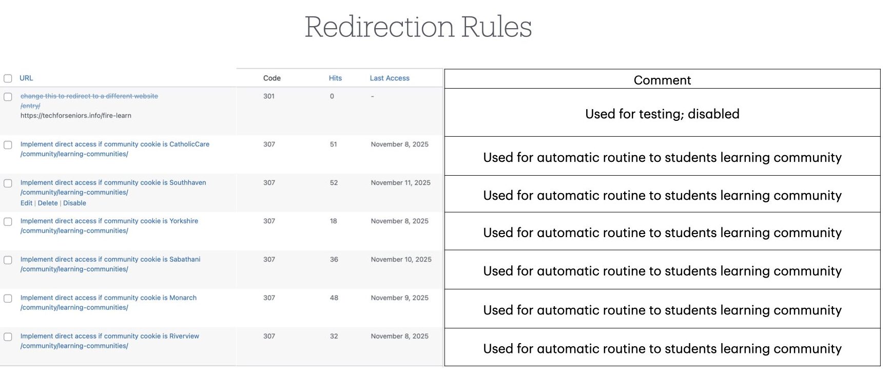 Here are the current Redirection Rules used in the system.