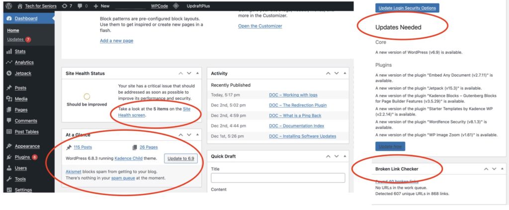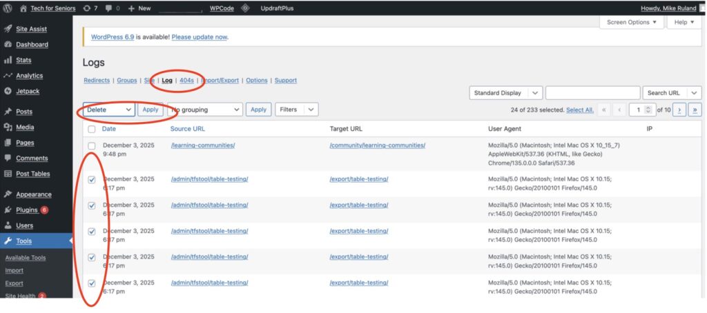 Clearing the redirection logs is easy. Go to the Tools menu and select redirection. Then select the logs to delete (checkmark) and select the drop down button and pick DELETE, finally select the Apply button. This example shows the log after changing the Category on a number of Posts from “export” to “Documentation”; notice all the redirections it caused. Once we cleaned things up, the redirections were no longer encountered. Note that the “Logs” and “404s” (not found) should both be checked.