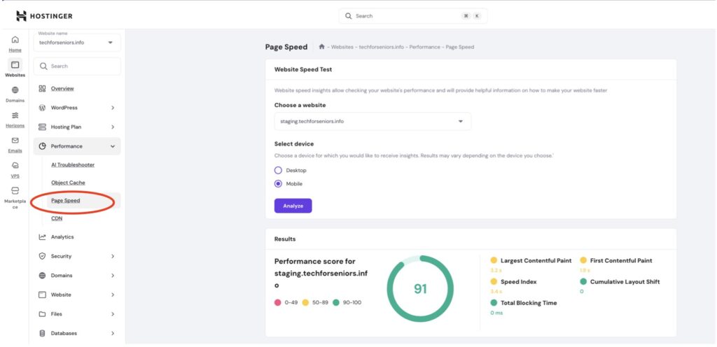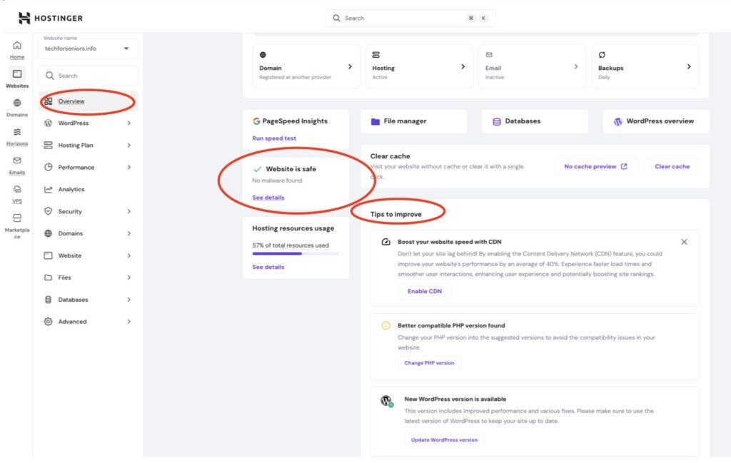 It is useful to check the information collected by the Hostinger system. Here we see the Overview screen where we can see the the website is safe and how much of our Hosintger resources we are using. There are also some tips on things we can improve.