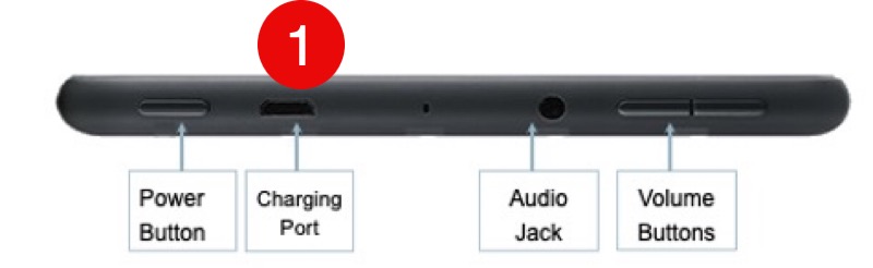 First, connect the smaller end of the cord to your Fire tablet Charging Port 1. If your tablet has a protective cover, a slot in the cover will give you access to this skinny port. If you can’t get the cable to plug in, flip the cord over and try again. The plug only goes in one direction. The larger plug on the cord will plug into the power adapter. Again if you can’t get it to plug in, flip it over and try again. Finally, plug the adapter into an electrical outlet.