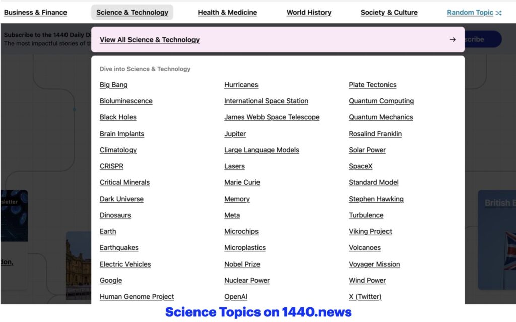 This screen contains a collection of interesting external sites where you can learn about fraud and how to protect yourself, Black Holes, Alzheimers, or Ancient Egypt and other topics, news from NASA, and how to discern fact from fiction in various news articles. The screen show below shows the topics available in the Science & Technology area alone, you can see the other categories available on the 1440 site. The other sites are just as ripe with useful and interesting information,
