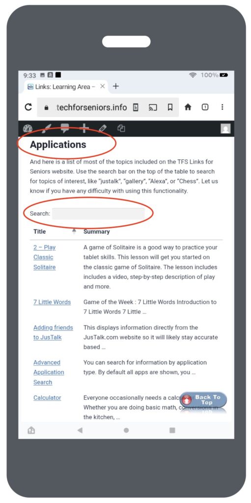 The search area (circled) allows you to search for topics rather than scrolling down through all the material. Just start typing and all the articles associated with your topic will be displayed