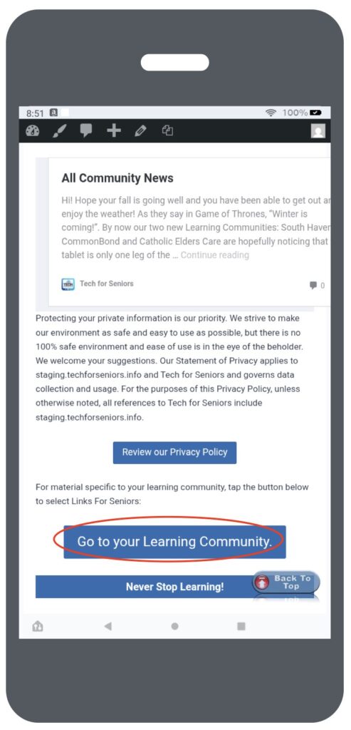 Each of our Learning Communities have different interests, questions, experience, priorities, etc. To accommodate this diversity, we have organized the Links For Seniors web site by Topic with the ability to select relevant material for each communities unique needs. Similar to the GFS/TFS Student Application on your tablet, you begin by advancing through your Community Landing page and go to your Learning Communities Specific site.
