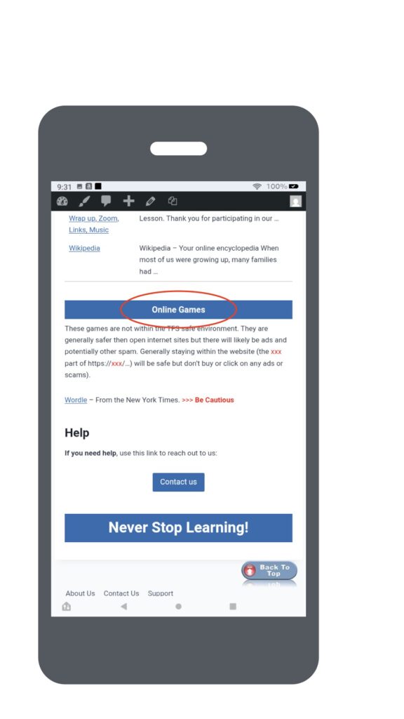 Games & Fun – contains info on games you might want to try. We have included one external website at the bottom of this page. If you decide to use it BE CAREFUL – consider reviewing Internet Hygeine 101.