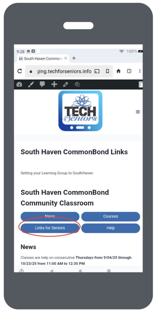 As we mentioned the first few screens are the same as when you used the Student App. When you get to your Learning Community landing page, you select “Links For Seniors” to enter the TFS secure website.